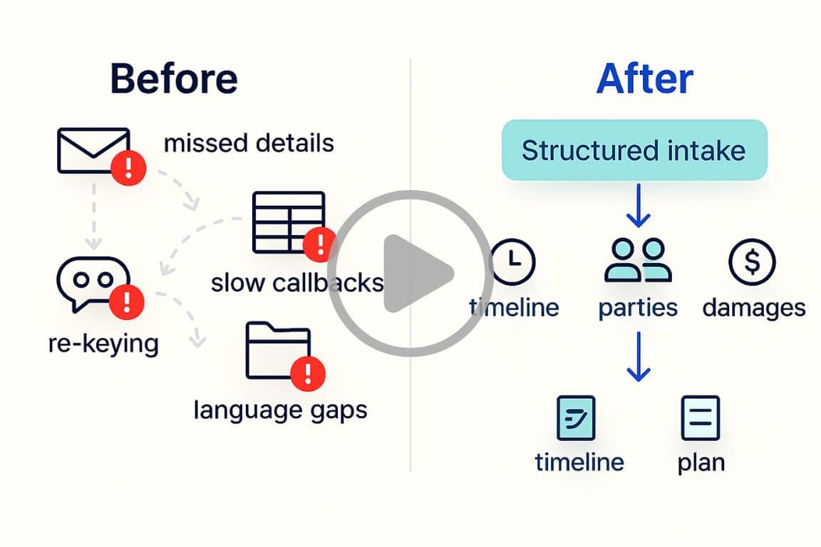 When intake depends on phone tags, static forms, and scattered notes, qualified matters slip away, and early case assessment slows down. Clients repeat themselves, staff re-key data, and critical details get buried—raising costs and risk. Bullet Points: