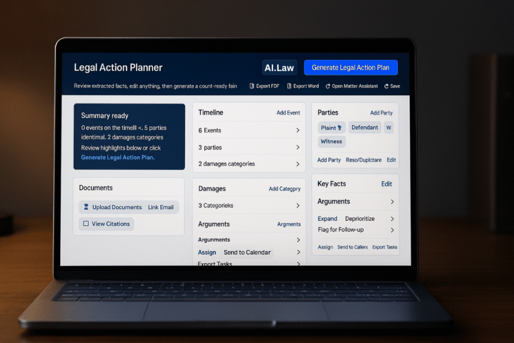 | Strategy output | Attorney notes only | No strategy artifact | Auto-generated Legal Action Plan |