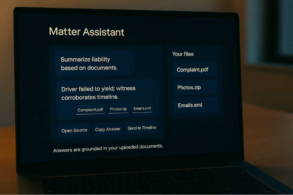 | Research and recall | Manual document review | Basic search | Matter Assistant chats with entire case file |