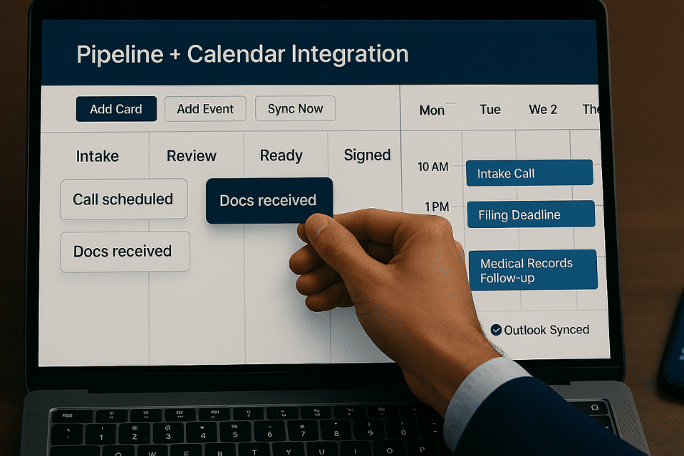 Kanban workflow with Outlook sync—see every case stage, track tasks, and never miss a follow-up.