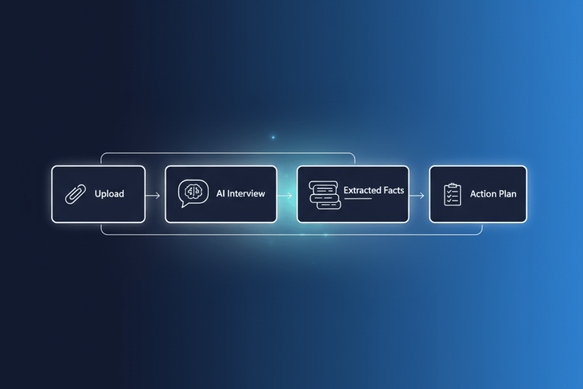 Upload your files, send a magic link, and let AI conduct a conversational interview that extracts complete facts and generates a review‑ready Legal Action Plan. You approve every output, with full audit trails and role‑based access.